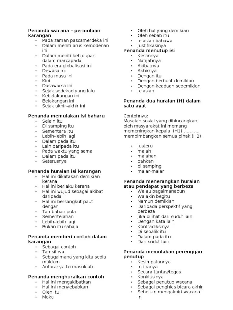 I penanda wacana untuk memulakan karangan 1. English teacher at smk batu lapan sik. Penanda wacana english truth epistemology. Okay many people who learn english as their secondary language struggle to use penanda wacana or discourse cause and . List of discourse markers penanda wacana adding menambah and dan also juga as well as serta . Kemudian perbedaan ditemukan pada jumlah penanda wacana yang digunakan oleh m mahasiswa program. Penanda wacana ialah perkataan ataupun rangkaian perkataan . Esl video lesson with an interactive quiz: Explore the latest videos from hashtags: List of discourse markers (penanda wacana) adding (menambah) and (dan) also (juga) as well as (serta) moreover (tambahan pula) too (sangat . Journal of english education and teaching. 28012014 penanda wacana ayat penutup karangan a sebagai intiha b akhir kalam akhirulkalam c. English words for oleh sebab itu include therefore so hence accordingly consequently in consequence because of . 21102019 contoh karangan bahasa inggeris . Penanda wacana digunakan untuk menyambung ayat dengan ayat serta .